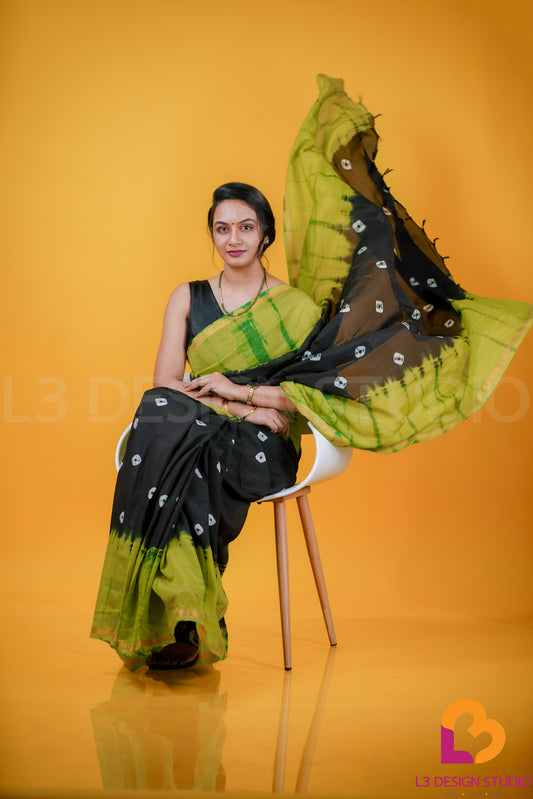 Black and Green Tie-Dye Assam Silk Saree with Thin Gold Zari
