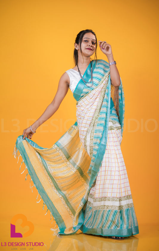 Off-White Linen Cotton Check Saree with Yellow and Pink Checks and Blue Printed Border