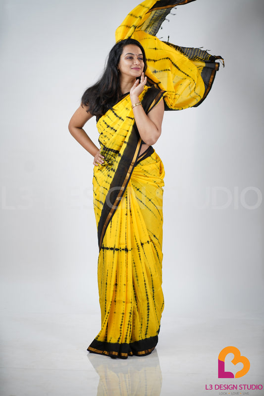 Yellow and Black Tie-Dye Assam Silk Viscose Saree with Thin Golden Zari