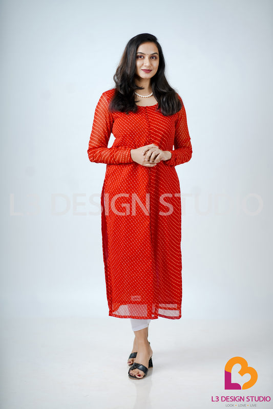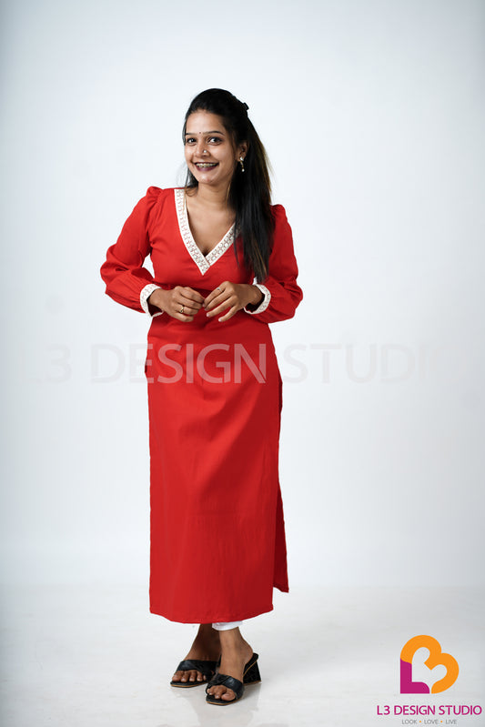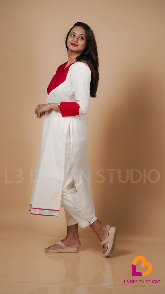 Off White Kurti with Red Golden Embroidered Silk Fabric