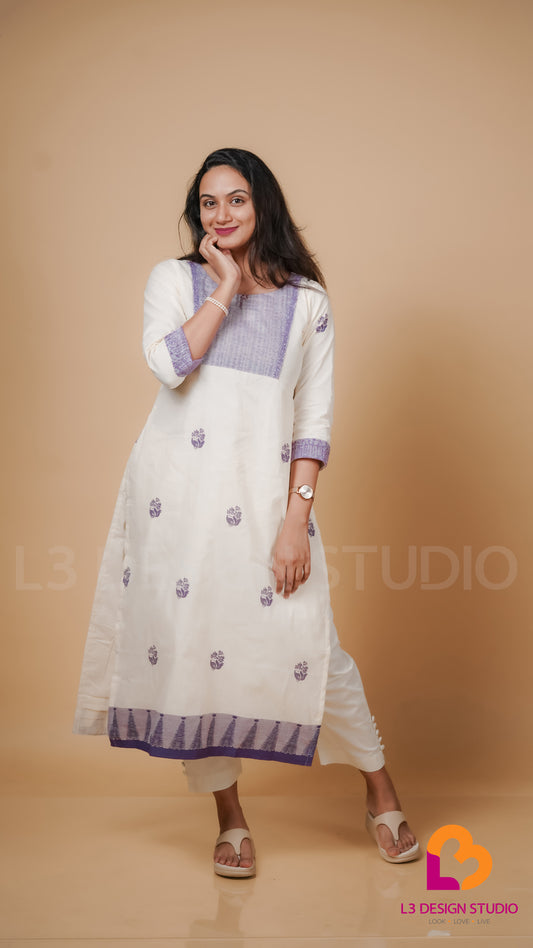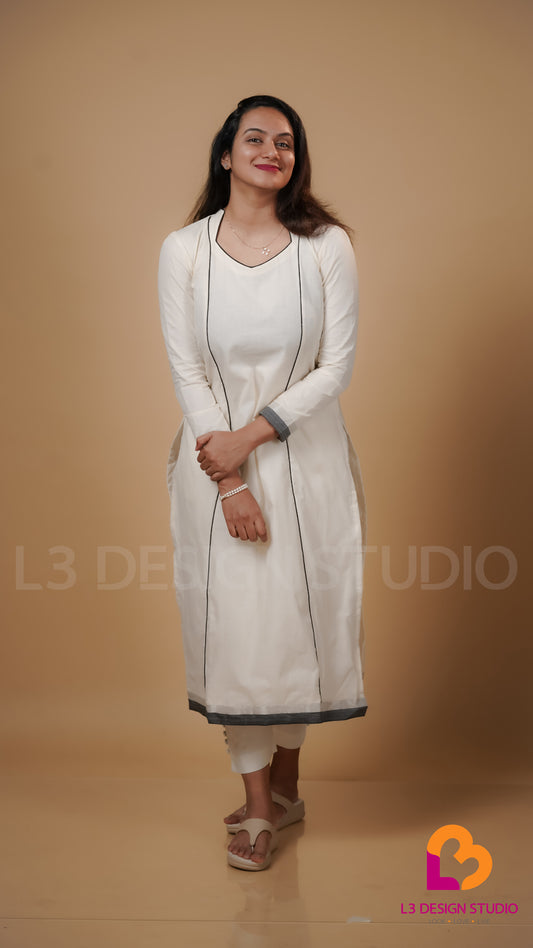 Offwhite Cotton Kurti with Brown Embroidered Organza Yoke and Silver Border