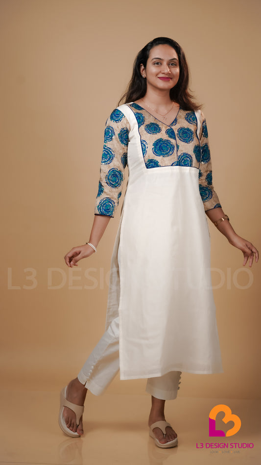 Offwhite Cotton Kurti with Printed Semi Silk Yoke and Sleeves