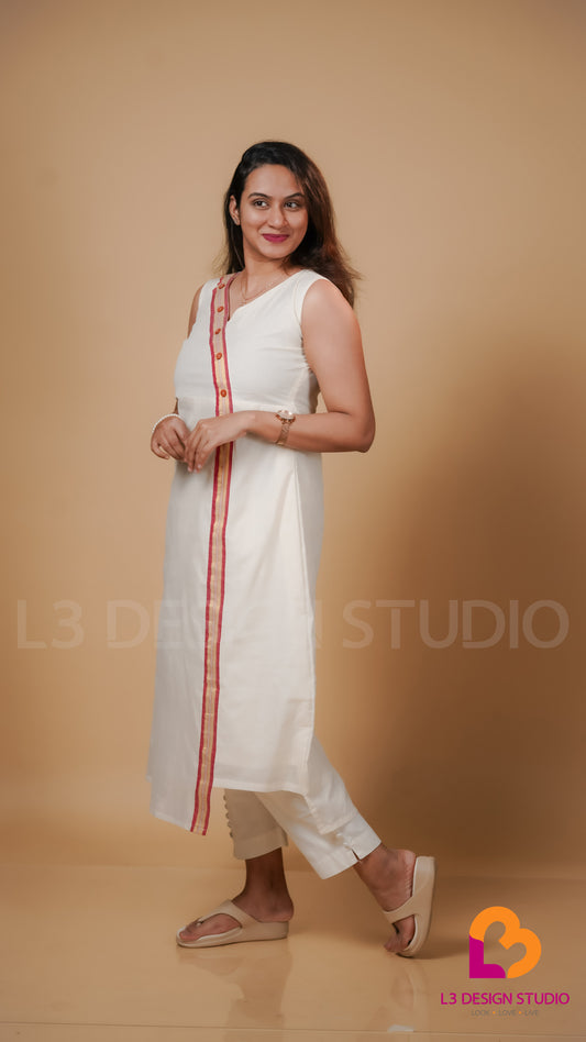 Offwhite Cotton Sleeveless V-Neck Kurti with Golden Border and Rust Accents