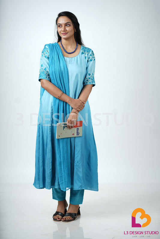 Sky Blue Ombré Aline Kurti Set with Embroidered Sleeves and Sequin Dupatta