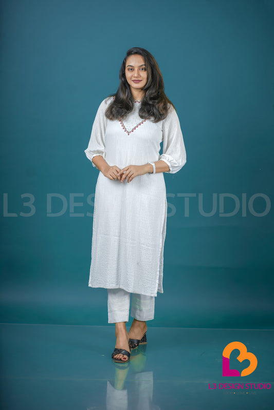 White Silver Lined Rayon Kurti with Embroidered Neck