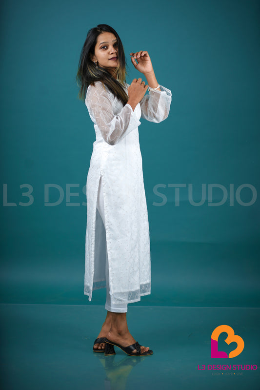 White Silver Lined Rayon Aline Dress with Organza Dupatta