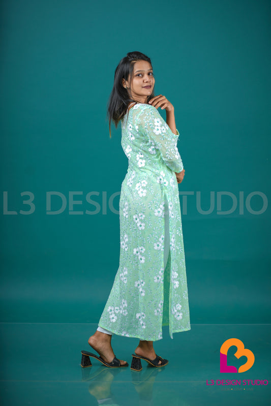 Pastel Green Floral Printed Pure Linen Sleeveless Kurti
